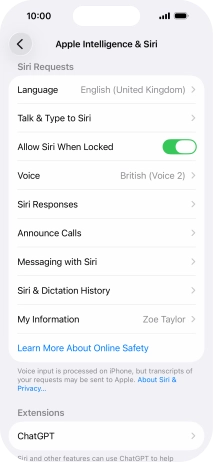 Press the required setting to turn the function on or off. If you turn on the function, you need to follow the instructions on the screen to set up Siri to recognise your voice.