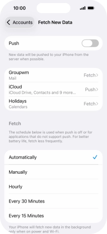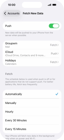 Press the required email account and follow the instructions on the screen to select settings for the specific account.