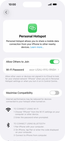 Key in the password for the personal hotspot and establish the connection.