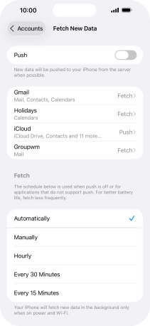 Press the required email account and follow the instructions on the screen to select settings for the specific account.