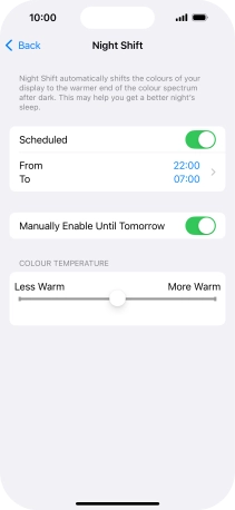 Press the indicator next to "Scheduled" to turn on the function and follow the instructions on the screen to select the required period of time for Night Shift.