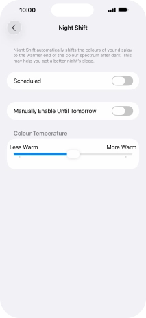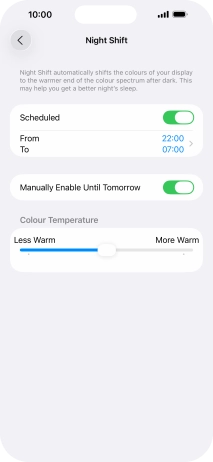 Press the indicator next to "Scheduled" to turn on the function and follow the instructions on the screen to select the required period of time for Night Shift.