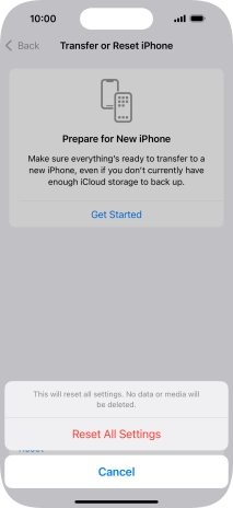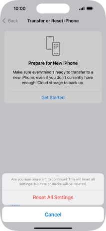 Press Reset All Settings. Wait a moment while the factory default settings are restored. Follow the instructions on the screen to set up your phone and prepare it for use.