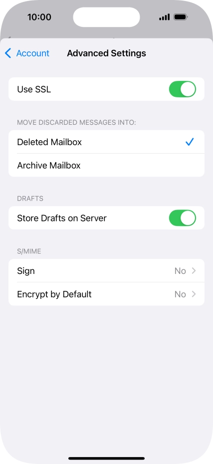 Press the required email account and follow the instructions on the screen to select settings for the specific account.