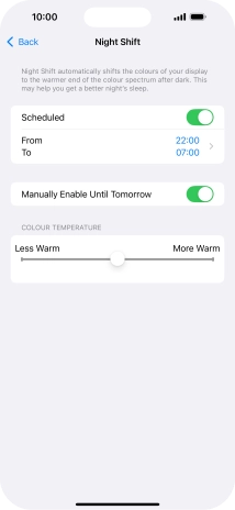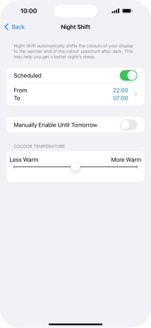 Press the indicator next to "Scheduled" to turn on the function and follow the instructions on the screen to select the required period of time for Night Shift.