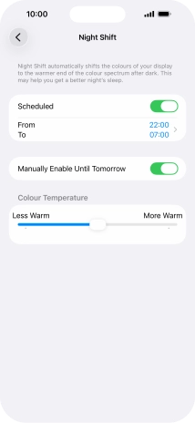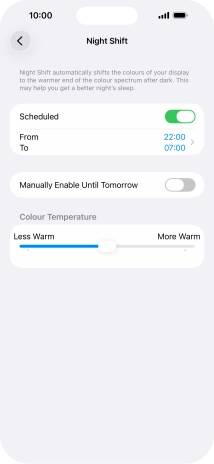 Press the indicator next to "Scheduled" to turn on the function and follow the instructions on the screen to select the required period of time for Night Shift.