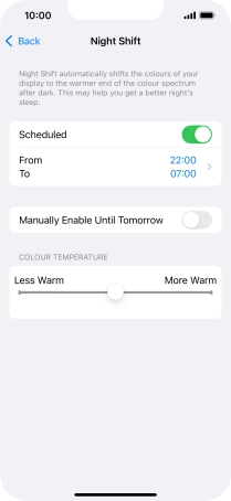 Press the indicator next to "Scheduled" to turn on the function and follow the instructions on the screen to select the required period of time for Night Shift.