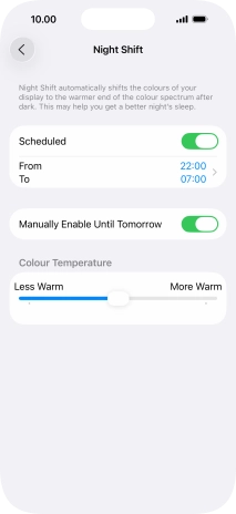 Press the indicator next to "Scheduled" to turn on the function and follow the instructions on the screen to select the required period of time for Night Shift.