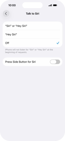 Press the required setting to turn the function on or off. If you turn on the function, you need to follow the instructions on the screen to set up Siri to recognise your voice.