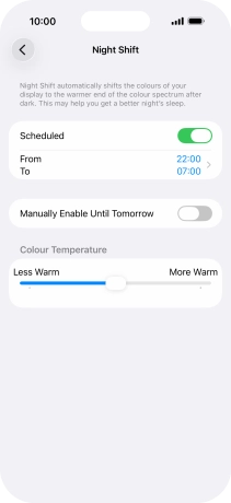 Press the indicator next to "Scheduled" to turn on the function and follow the instructions on the screen to select the required period of time for Night Shift.