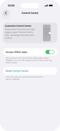 If you turn on the function, Control Centre can be used both on the home screen and while using other applications.