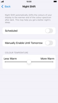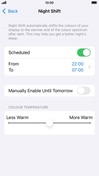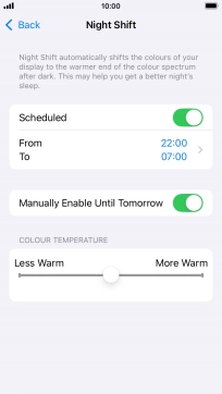 Press the indicator next to "Scheduled" to turn on the function and follow the instructions on the screen to select the required period of time for Night Shift.