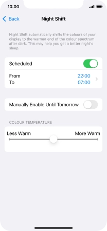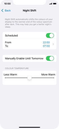 Press the indicator next to "Scheduled" to turn on the function and follow the instructions on the screen to select the required period of time for Night Shift.