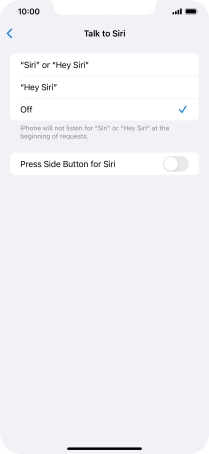 Press the required setting to turn the function on or off. If you turn on the function, you need to follow the instructions on the screen to set up Siri to recognise your voice.