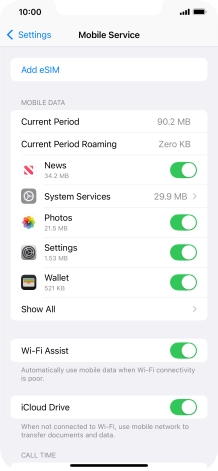 Press the indicator next to "Mobile Data" to turn the function on or off.