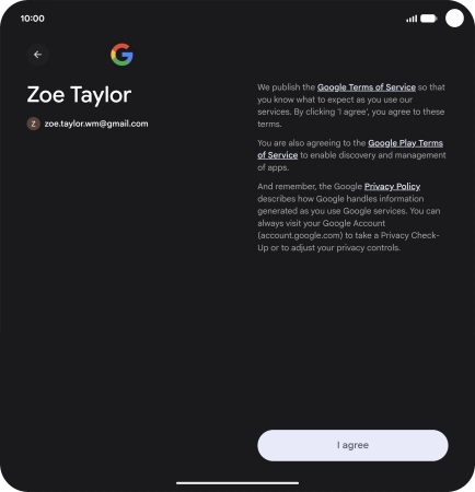Press I agree and follow the instructions on the screen to select settings for your Google account.
