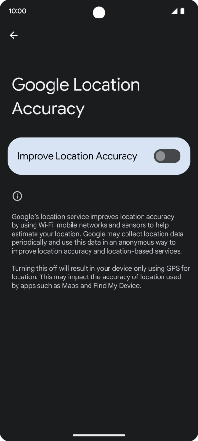 If you press the indicator next to "Improve Location Accuracy" to turn off the function, your phone can find your exact position using the GPS satellites but it may take longer as there is no access to supplementary information from the mobile network or nearby Wi-Fi networks.