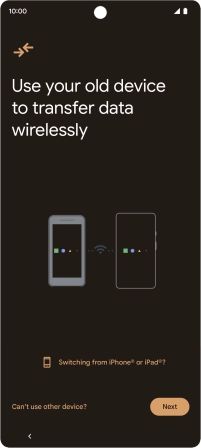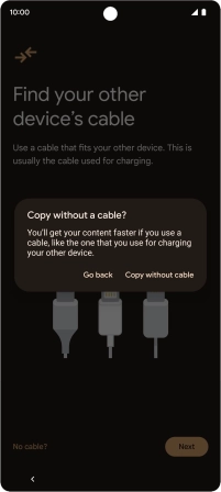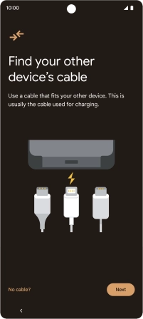 If you have a cable which can connect the two phones, insert the cable and follow the instructions on the screen to transfer content to your phone. If you don’t have a cable, press No cable?.
