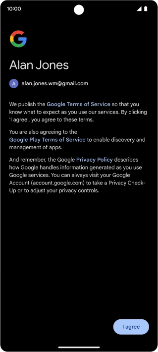 Press I agree and follow the instructions on the screen to select settings for your Google account.
