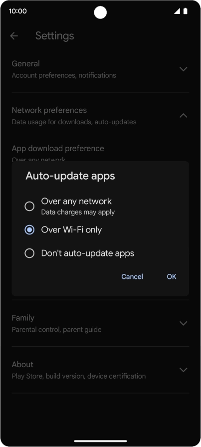 To turn on automatic update of apps using Wi-Fi, press Over Wi-Fi only.