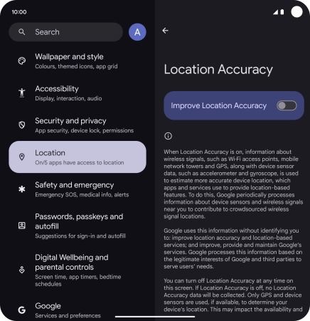 If you press the indicator next to "Improve Location Accuracy" to turn off the function, your phone can find your exact position using the GPS satellites but it may take longer as there is no access to supplementary information from the mobile network or nearby Wi-Fi networks.