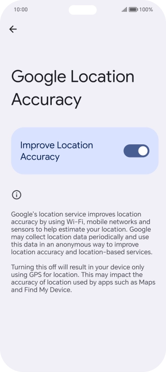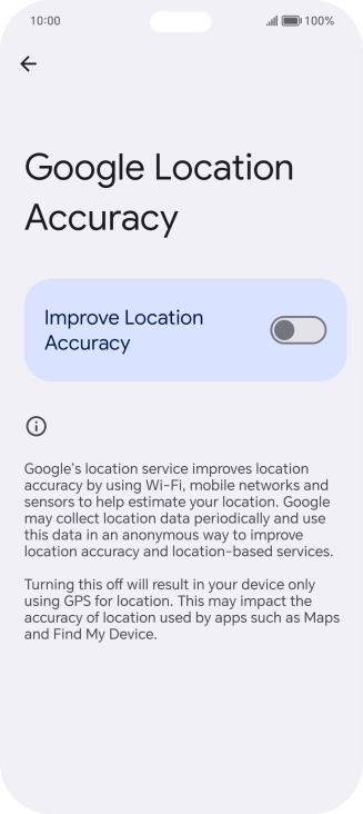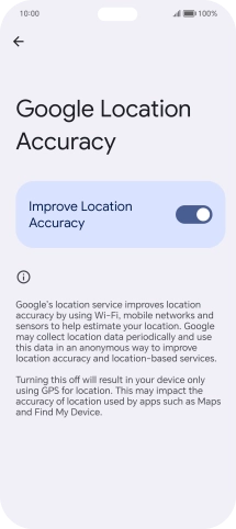 If you press the indicator next to "Improve Location Accuracy" to turn off the function, your phone can find your exact position using the GPS satellites but it may take longer as there is no access to supplementary information from the mobile network or nearby Wi-Fi networks.