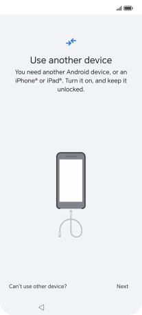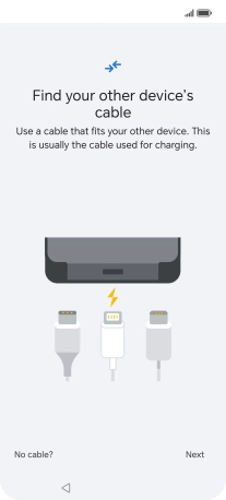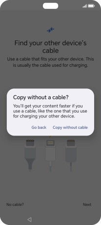 If you have a cable which can connect the two phones, insert the cable and follow the instructions on the screen to transfer content to your phone. If you don’t have a cable, press No cable?.