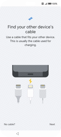 If you have a cable which can connect the two phones, insert the cable and follow the instructions on the screen to transfer content to your phone. If you don’t have a cable, press No cable?.