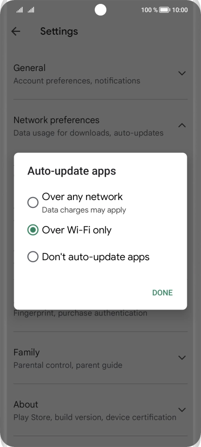 To turn on automatic update of apps using Wi-Fi, press Over Wi-Fi only.
