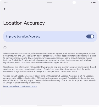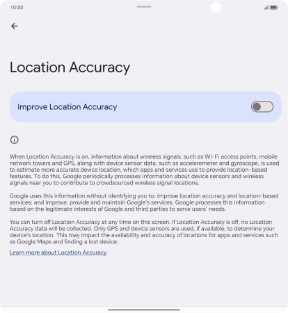 If you press the indicator next to "Improve Location Accuracy" to turn off the function, your phone can find your exact position using the GPS satellites but it may take longer as there is no access to supplementary information from the mobile network or nearby Wi-Fi networks.