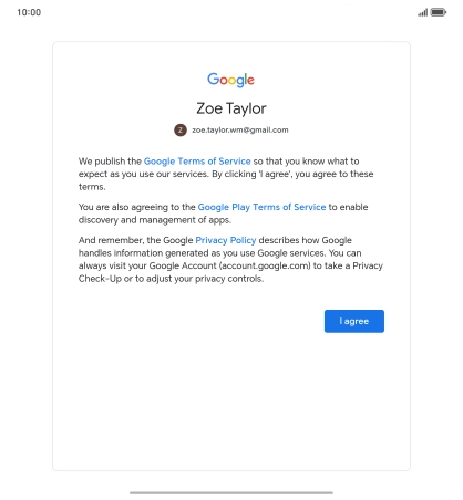 Press I agree and follow the instructions on the screen to select settings for your Google account.