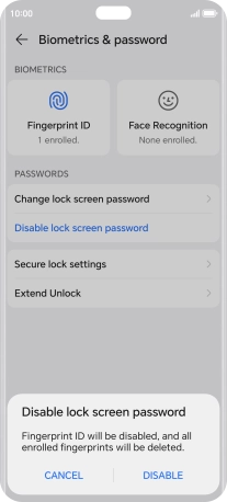 Press Disable lock screen password and key in the additional phone lock code you created earlier.