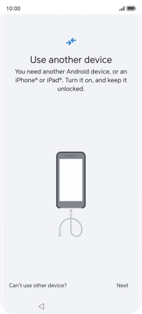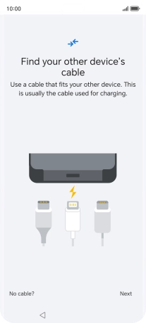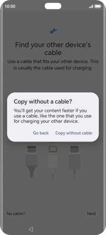 If you have a cable which can connect the two phones, insert the cable and follow the instructions on the screen to transfer content to your phone. If you don’t have a cable, press No cable?.