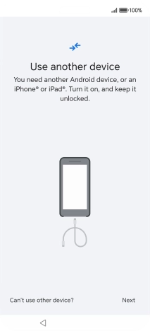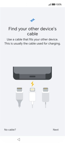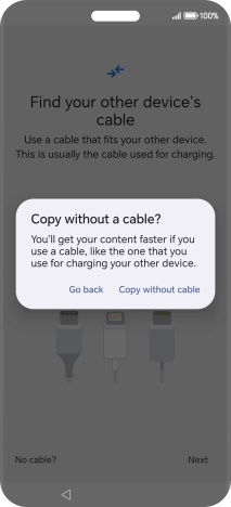 If you have a cable which can connect the two phones, insert the cable and follow the instructions on the screen to transfer content to your phone. If you don’t have a cable, press No cable?.