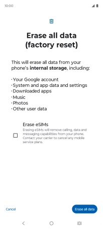 Press Erase all data. Wait a moment while the factory default settings are restored. Follow the instructions on the screen to set up your phone and prepare it for use.