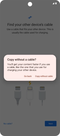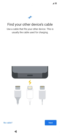If you have a cable which can connect the two phones, insert the cable and follow the instructions on the screen to transfer content to your phone. If you don’t have a cable, press No cable?.