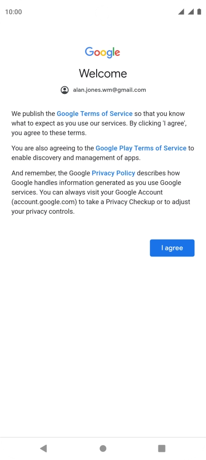 Press I agree and follow the instructions on the screen to select settings for your Google account.