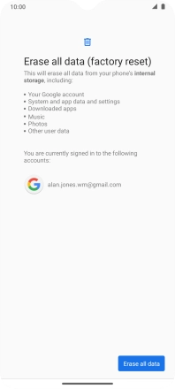 Press Erase all data. Wait a moment while the factory default settings are restored. Follow the instructions on the screen to set up your phone and prepare it for use.