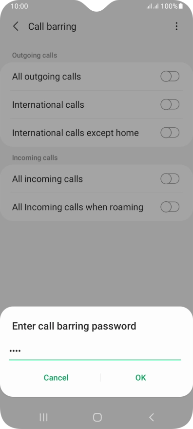 Key in your barring password and press OK. The default barring password is 1919.