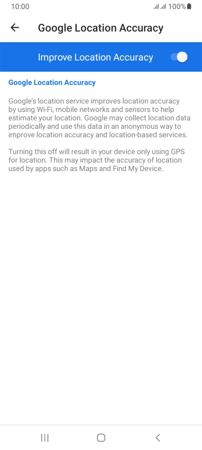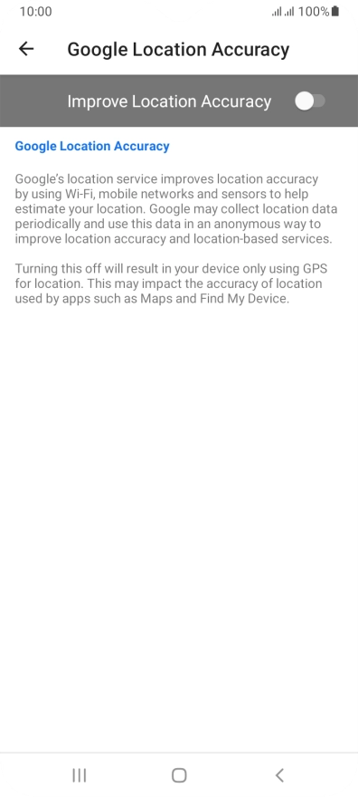 If you press the indicator next to "Improve Location Accuracy" to turn off the function, your phone can find your exact position using the GPS satellites but it may take longer as there is no access to supplementary information from the mobile network or nearby Wi-Fi networks.
