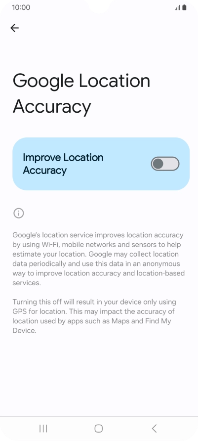 If you press the indicator next to "Improve Location Accuracy" to turn off the function, your phone can find your exact position using the GPS satellites but it may take longer as there is no access to supplementary information from the mobile network or nearby Wi-Fi networks.