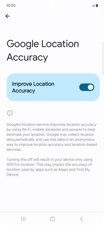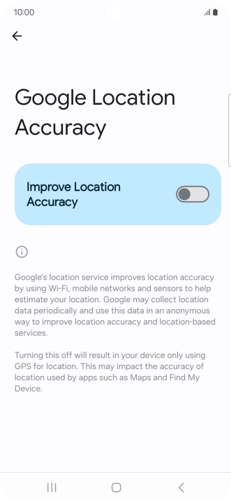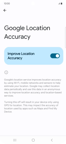 If you press the indicator next to "Improve Location Accuracy" to turn off the function, your phone can find your exact position using the GPS satellites but it may take longer as there is no access to supplementary information from the mobile network or nearby Wi-Fi networks.