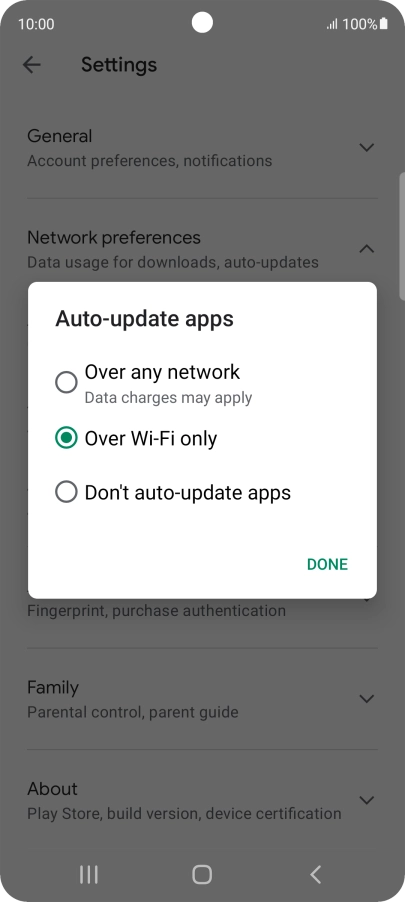 To turn on automatic update of apps using Wi-Fi, press Over Wi-Fi only.