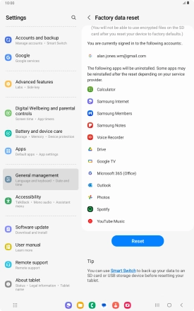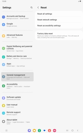 Press Delete all. Wait a moment while the factory default settings are restored. Follow the instructions on the screen to set up your tablet and prepare it for use.