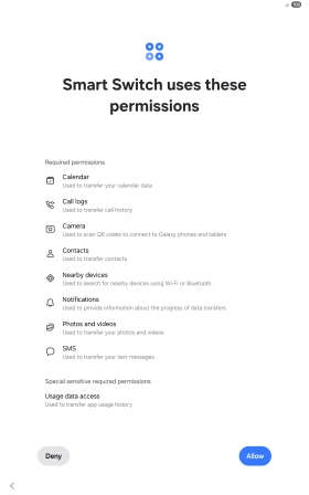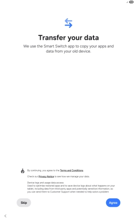 You can transfer the contents of another device to your tablet when it's activated for the first time and after a factory reset. When this screen is displayed, your tablet is ready to transfer contents from another device.