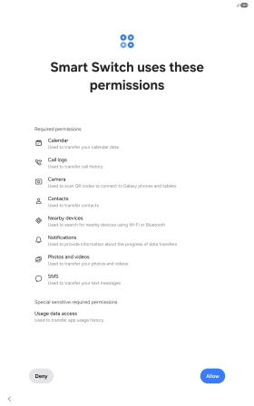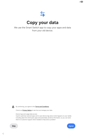 You can transfer the contents of another device to your tablet when it's activated for the first time and after a factory reset. When this screen is displayed, your tablet is ready to transfer contents from another device.