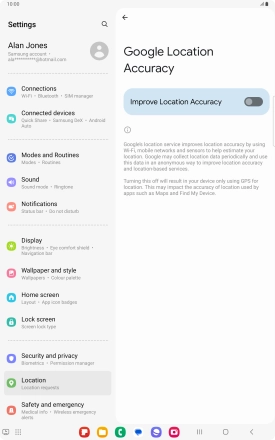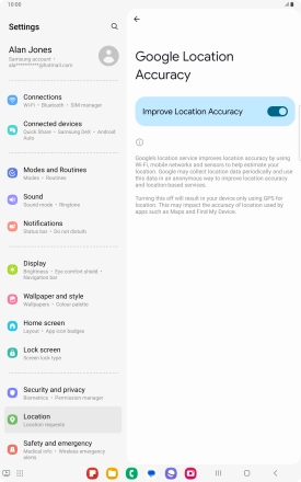 If you press the indicator next to "Improve Location Accuracy" to turn off the function, your tablet can find your exact position using the GPS satellites but it may take longer as there is no access to supplementary information from the mobile network or nearby Wi-Fi networks.