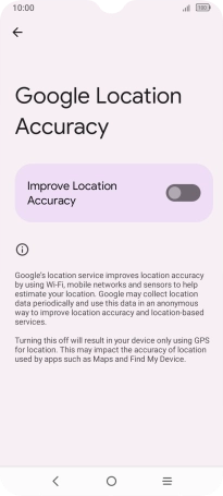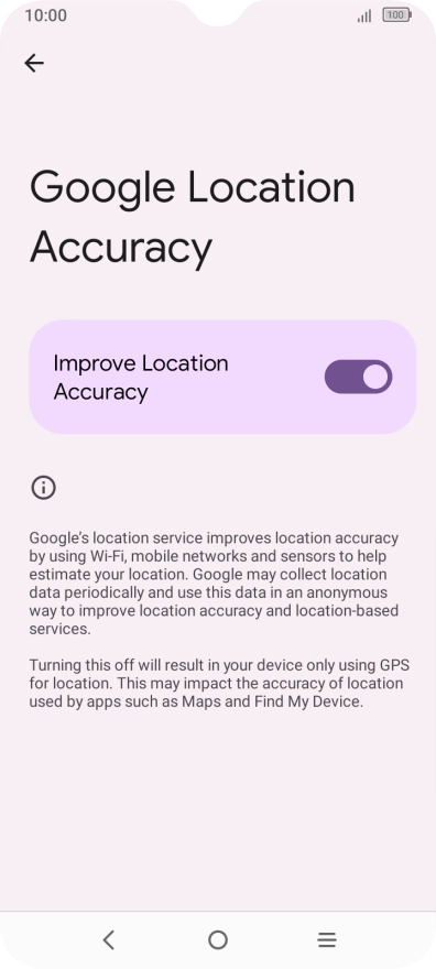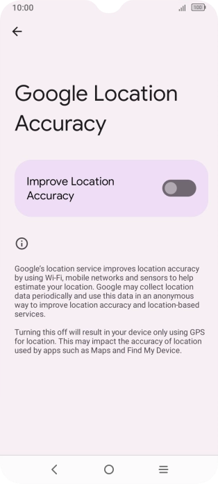 If you press the indicator next to "Improve Location Accuracy" to turn off the function, your phone can find your exact position using the GPS satellites but it may take longer as there is no access to supplementary information from the mobile network or nearby Wi-Fi networks.