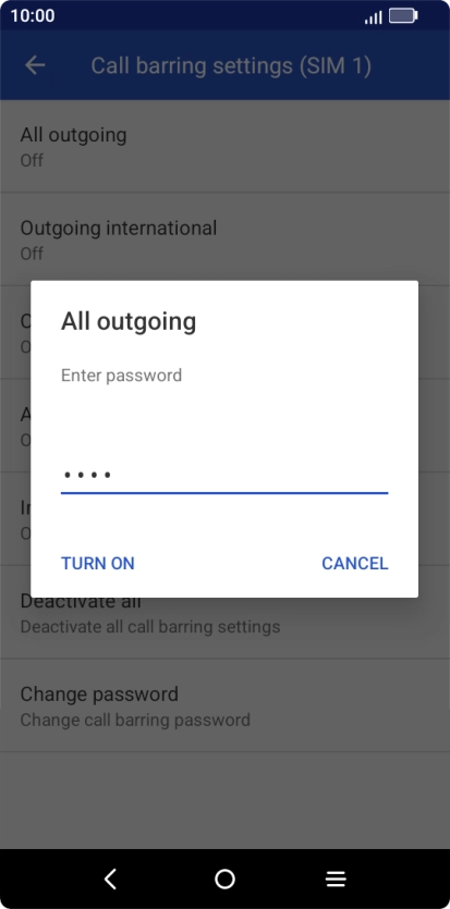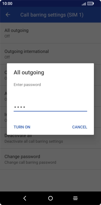 Key in your barring password and press TURN ON. The default barring password is 1919.