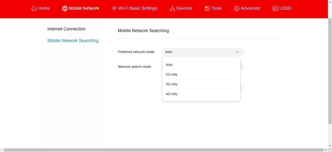 There may be different network modes available depending on where you are. The network mode influences the data speeds your router can achieve. Remember, you need to establish a connection to the router web interface.